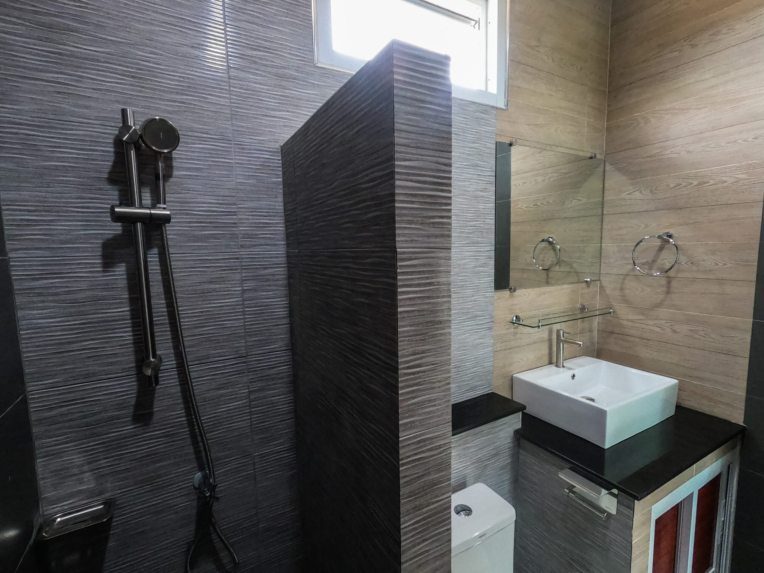 • พื้นห้องน้ำ - เทพื้นด้วยคอนกรีตหล่อในที่และขัดหยาบ รอปูพื้นผิว